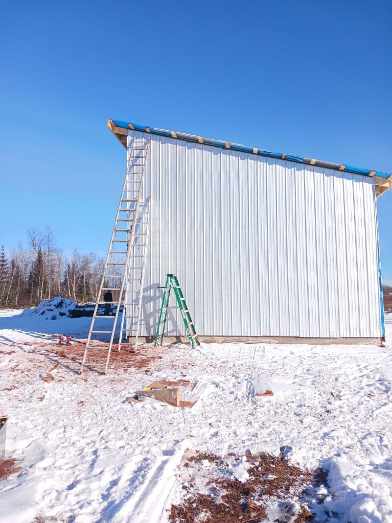 On just such a day we finally finished the end wall we had abandoned. The 17’4″ sheet leftover from the front wall fit the next-to-last slot quite well, and the last sheet (actually a partial width sheet. Only about 2/3 wide) we were able to add a single 12″ splice at the bottom in a way as not to be glaringly noticeable. It isnt perfect, by any means, but it means we can finish without having to purchase more steel, and that matters a lot.