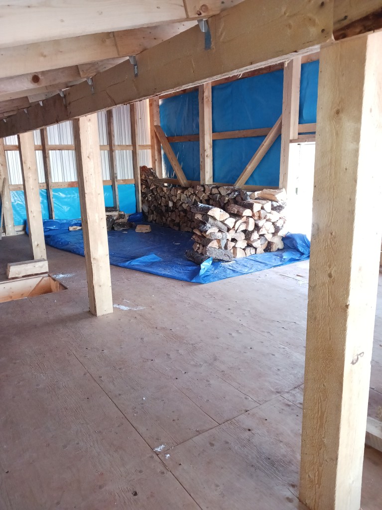 While we were figuring out the wall, mom and the kids were beginning to haul the wood inside — now that we HAVE an inside, more or less — to dry out. We’ll be heating and cooking entirely with wood, so it doesnt do for the entire supply to be damp. Some at least needs to be dry and ready when the stove is installed. We have somewhere around 10 cord to split, stack and store, so any amount we can get moved and dry is good.