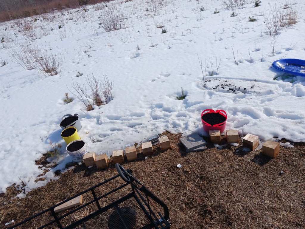 A few quick holes into the bottom of each bucket and planter, and then off to the dirt. I have had 3 bags of soil here, just waiting, and it was warm enough (finally) that they weren’t frozen solid anymore. 1.5 bags gave me 4 full planters and a solid gardener’s manicure. First of the season.