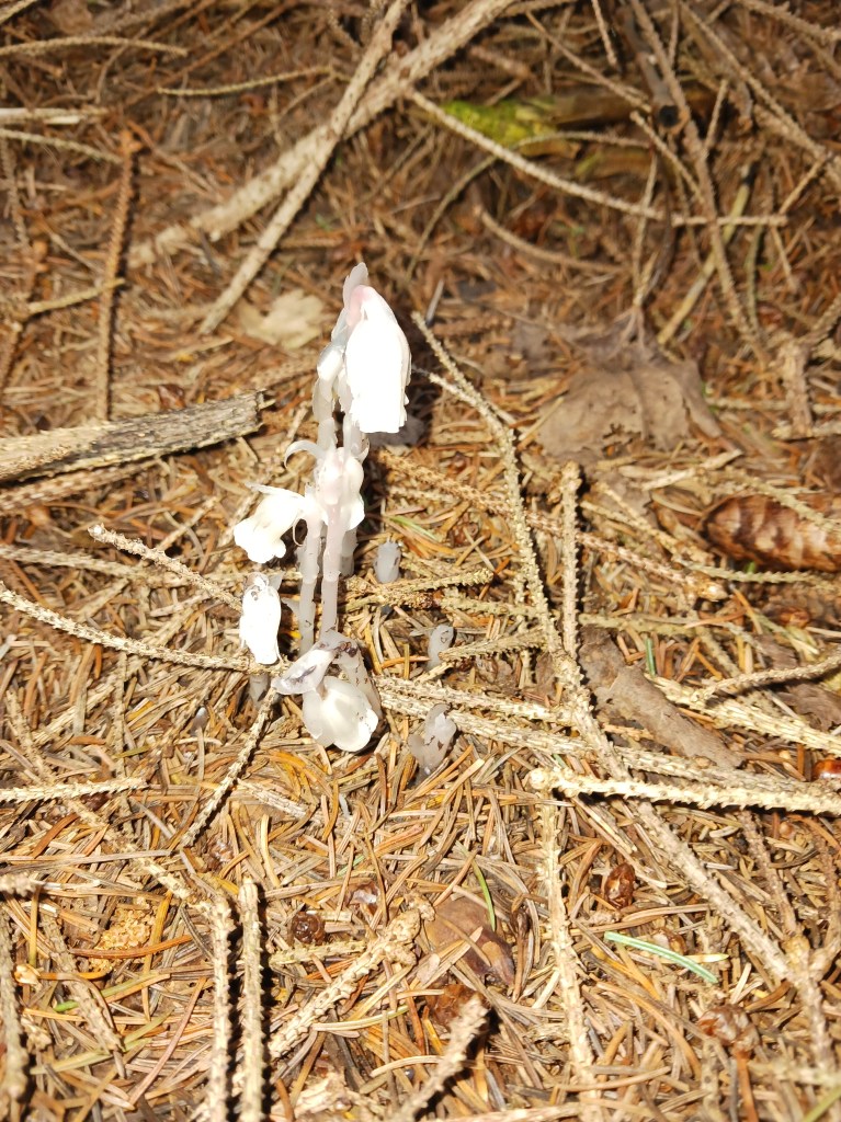 Today, visiting a friend’s property, I was granted permission to forage from her incredibly prolific ghost pipe. One must find ghost pipe where it is. You cannot transplant it, as it has a very complex web of needs and will not survive if any part of that web is damaged.