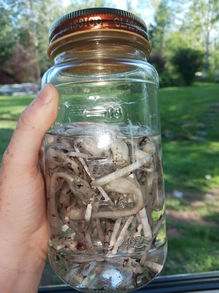 It’s only up for a bit over a week each year. Last year was the first time I’d harvested it, and that was when I was recovering from extreme blood loss. Walking the hundred yards into the forest was an extreme workout at the time. This year, I am in far better shape. The blackflies were a terrible nuisance, but it didnt take terribly long to fill up my jar.