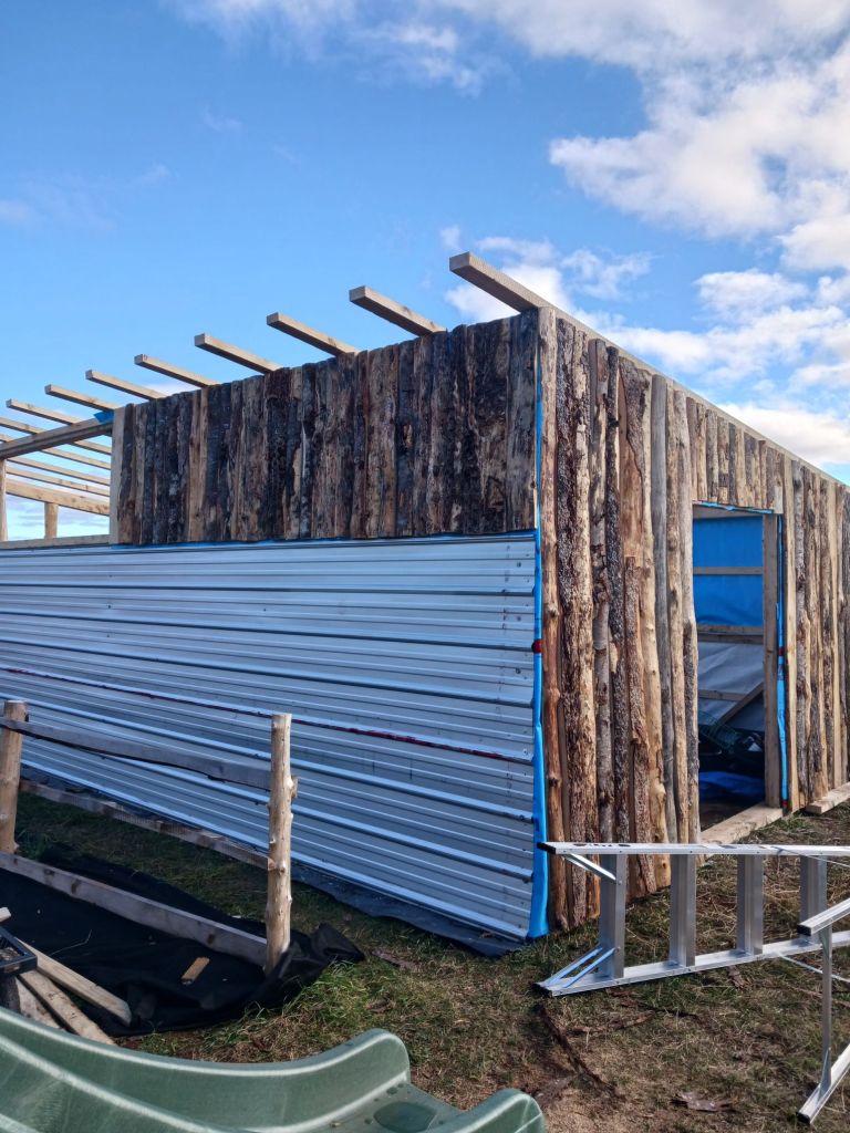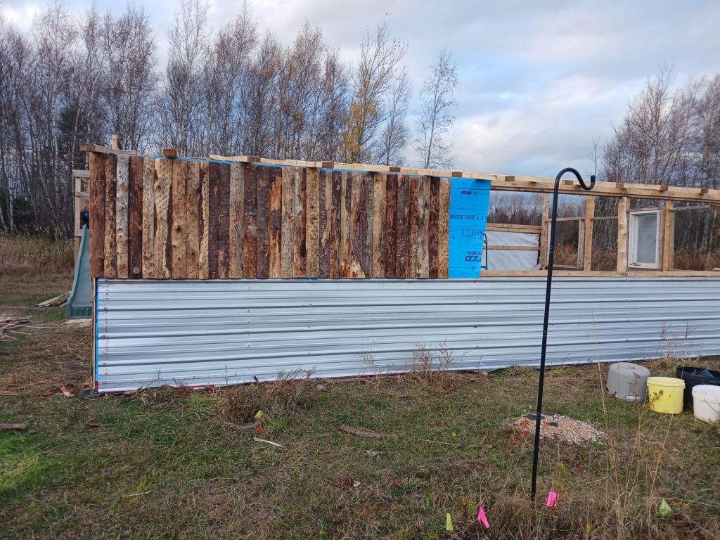 And over this past few days, finally got the roof on. Got the Palram up yesterday, and then today when we were unexpectedly stranded at home due to a thaw that wasn’t forecast, plus an entire night’s worth of heavy rain that turned the driveway into soup with the van up here at the house, we got the steel and trim up, also